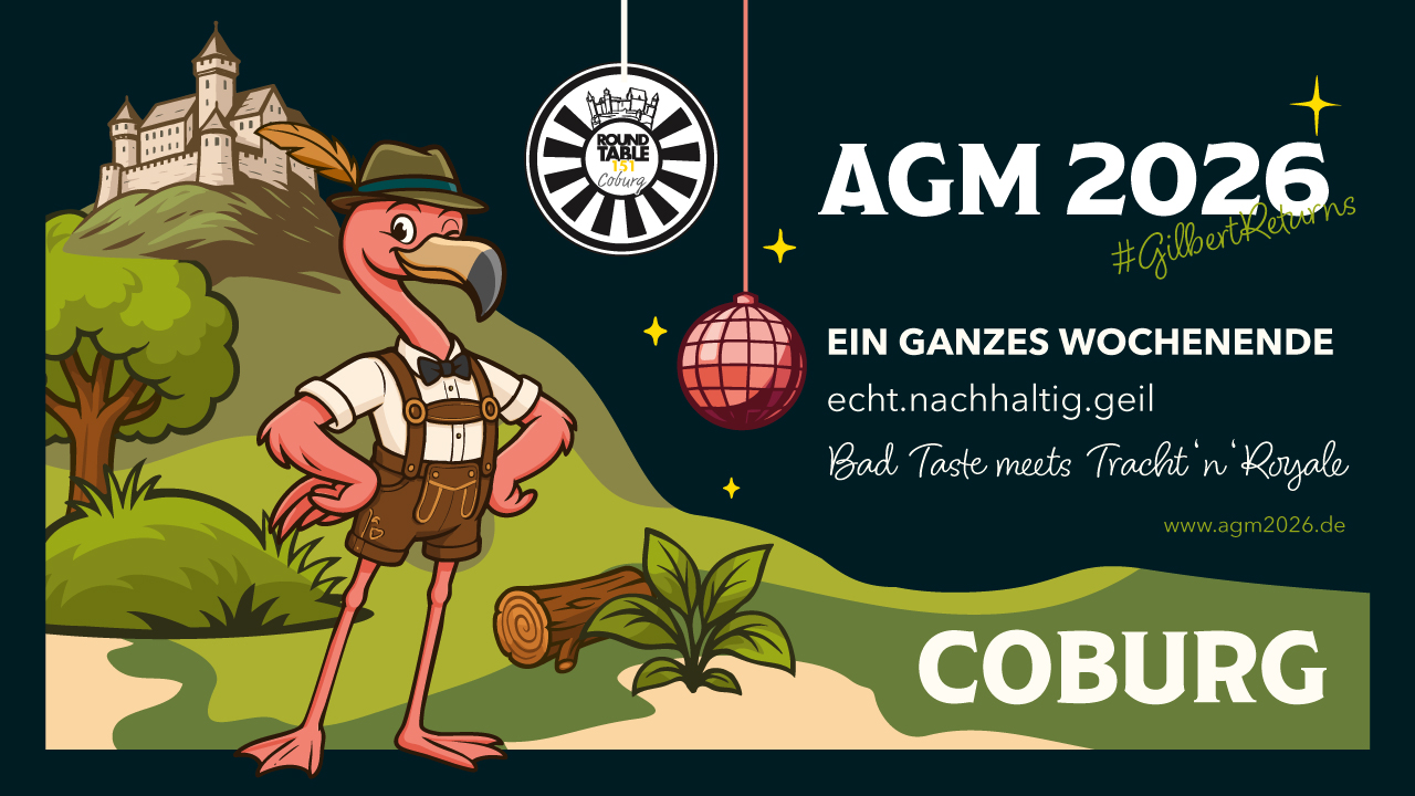 Vom 12. bis 14. Juni 2026 wird Coburg zum Treffpunkt der Round Table-Familie. Unter dem Motto #GilbertReturns gestalten wir ein AGM, das Tradition und Zukunft verbindet: nachhaltig, ungezwungen, familienfreundlich – und mit klarer Haltung.